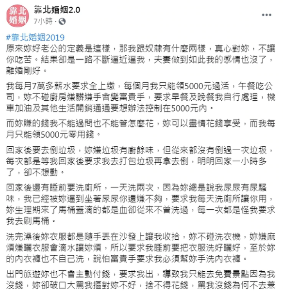 原PO指出,他比老婆晚下班回家,卻都被指使要打包垃圾去倒,還要每天洗廁所,都是因為老婆嫌髒,更要求替她手洗內衣褲。夫妻倆出門玩時,因為自己身上沒什麼錢,老婆也不會付錢,只能去些免費景點,竟被罵小氣、對她不好,還要求去兼差多賺點錢當做家庭娛樂費,對方的薪水卻從來只有自己享受。