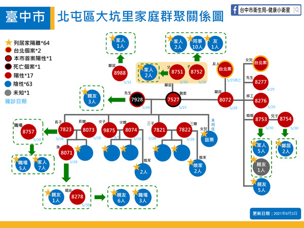而根據台中衛生局調查,案8072與案7527(筍農妻子,已於6月12日去世)感情很好,經常一起聊天,案8072在5月11日至19日曾接待來自萬華的朋友,結果朋友返回台北後確診,25日不幸身亡;後續進行匡列,發現案8072的丈夫、女兒、家中的外籍移工也都相繼確診,女兒也曾與該名萬華朋友一起吃飯,16日回台北後出現症狀,20日確診新冠肺炎。