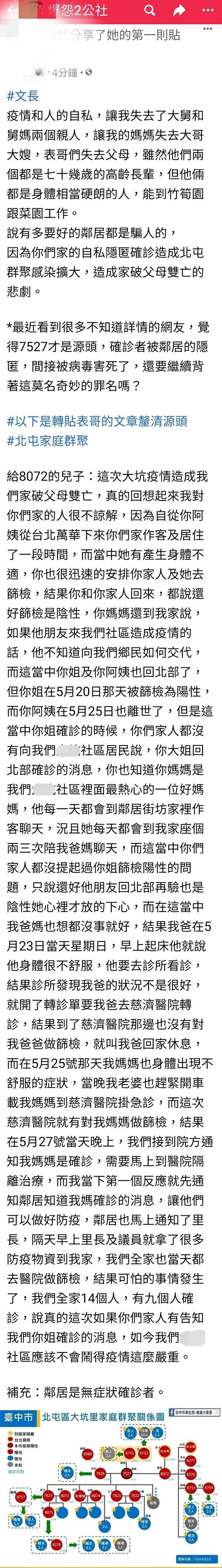 台中北屯家庭群聚案累計共有21人確診,其中案7928李姓筍農(78歲)是台中首例死亡個案。筍農的兒子透過親人於臉書「爆怨2公社」PO文還原群聚案的源頭,直指是鄰居婦人案8072隱匿,