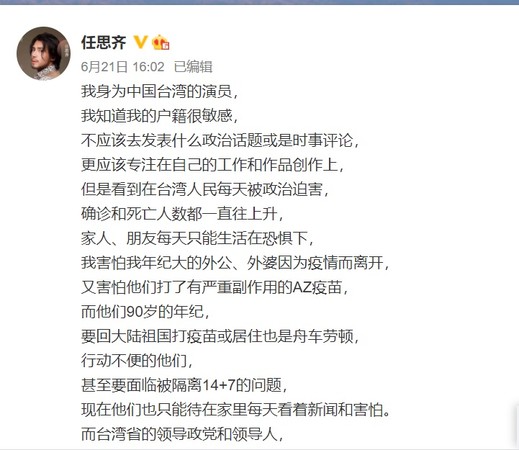 任思齊在微博發文,劈頭第一句就強調自己是「中國台灣」的演員,