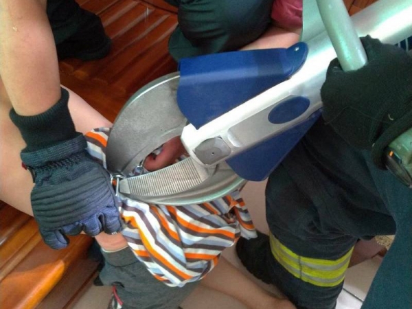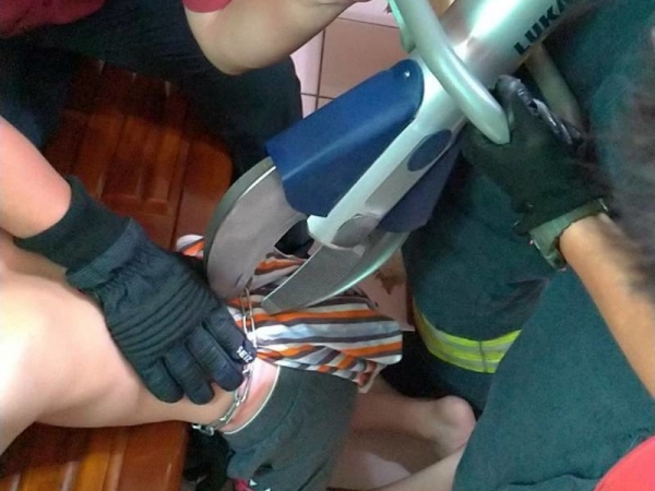 苗栗縣頭份消防分隊是接獲報案,指稱一名八歲男童被困在家中,消防人員前往救援,發現男童竟然被長約五米的鐵鍊鎖住,消防人員利用油壓剪等破壞器材才幫男童脫困並送醫。
