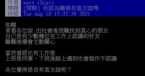 該網友在網路論壇PTT WomenTalk板上,發了一篇標題為「你認為職場有真友誼嗎」的文章,內容提到,經常聽說出社會後很難找到真心的朋友,不過自己是有少數幾位在工作上認識的好友,離職後還會主動關心。當然,也遇過「上班是同事,下班不認識」的狀況,因此心生好奇,想了解其他網友認為「職場上是否有真友誼呢?」