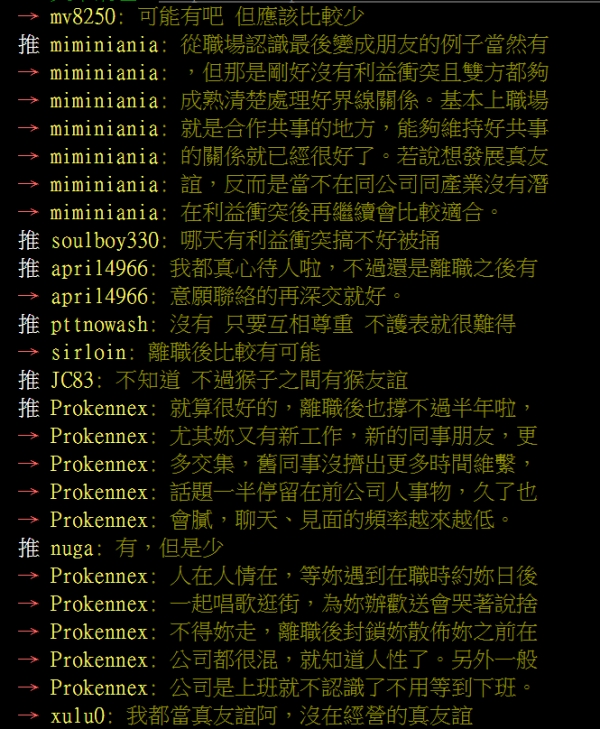 網友們表示,從現實面來看,「有利益衝突就不會有真友誼了」、「從職場認識最後變成朋友的例子當然有,但那是剛好沒有利益衝突且雙方都夠成熟,能清楚處理好界線關係。」