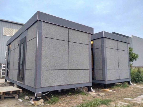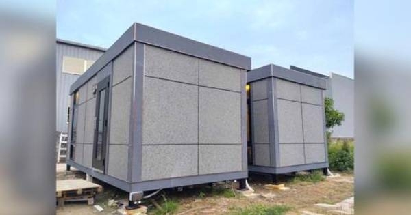 ▼原po介紹說:「高房價時代,創造低價豪宅,基本款型49.5萬,不含內部裝潢,近7坪。」從照片中可以看到,一間7坪大的屋子靠4個角固定在地面上,灰色的牆面很有質感,底部依稀看得到管線。