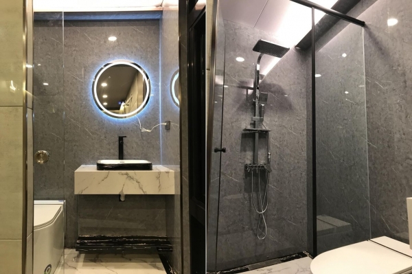 ▼屋子的內部令人眼前一亮,浴室的設計十分用心,整體採用大理石紋風格,以灰、黑、白三色為主調,還是乾濕分離,看起來就像飯店浴室一樣高級,其他區域則沒有裝潢。這間貨櫃屋總坪數約7坪,照片中的這種基本款型售價49.5萬,另外還有更高級的貨櫃屋可選。