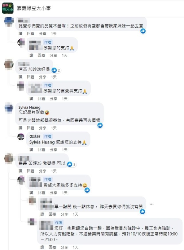 此外,老闆也積極做活動,像是買5送1,以及1杯就可外送。消息曝光後,網友紛紛給予打氣,「你們的紅茶比50嵐還好喝」、「看你不斷在社團PO文做市場調查並調整,覺得你很用心在經營」、「辛苦了!希望未來能夠一直秉持良心做生意,因為真的不容易」、「可以耶~下次回嘉義買起來」、「 茶類25元我覺得很可以」、「老闆有心我就支持」、「台北是什麼天價」。